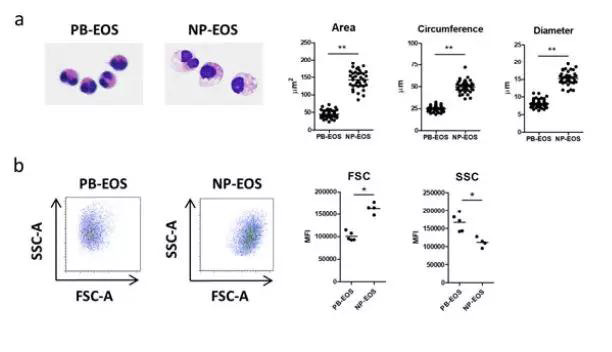 背景:嗜酸粒細(xì)胞是一種多功能粒細(xì)胞,能夠釋放多種細(xì)胞因子、趨化因子和脂質(zhì)介質(zhì)。我們以前報道過嚴(yán)重哮喘患者外周血來源的嗜酸粒細(xì)胞脂肪酸代謝失調(diào),但是過敏性炎癥組織中嗜酸粒細(xì)胞的功能特征在很大程度上仍未被檢測出來。方法:我們建立了一種從嗜酸性鼻竇炎(NP-EOS)患者鼻息肉中分離CD69hi CCR3low CXCR4- siglec-8int 嗜酸粒細(xì)胞的方法,并與健康受試者外周血來源的嗜酸粒細(xì)胞(PB-EOS)進(jìn)行脂質(zhì)組學(xué)、蛋白質(zhì)組學(xué)和轉(zhuǎn)錄組學(xué)的多組學(xué)分析,以分析NP-EOS。