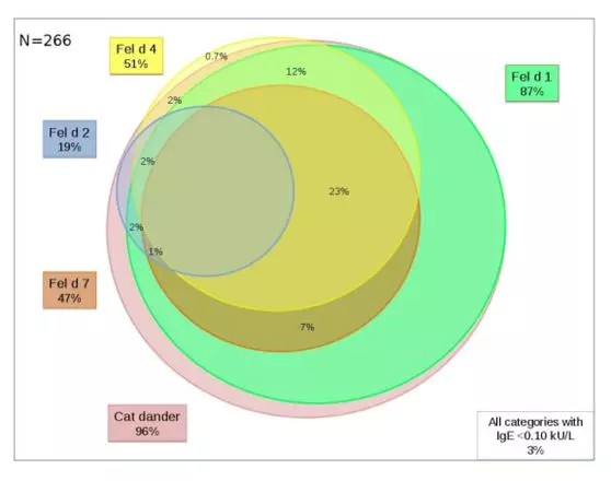 ?、?貓毛敏感的分子模式因人而異,它們與哮喘患者炎癥的關(guān)系還沒有得到廣泛的研究;② 納入哮喘病人266人(10-35歲),其IgE對貓毛、狗毛和馬毛敏感(ImmunoCAP),分析IgE對貓毛過敏原成分Fel d1(分泌球蛋白)、Fel d2(血清白蛋白)、Fel d4、Fel d7(脂蛋白)的影響;③ IgE對Fel d2的水平與FeNO (p=0.012)和總IgE (p<0.001)有相關(guān);④IgE對于Fel d 1和貓毛提取的炎癥標(biāo)記物無任何關(guān)聯(lián)(p = 0.23?0.51);⑤ 青年哮喘患者血清中IgE對脂蛋白(Fel d 4)和血清白蛋白(Fel d 2)的水平與2型生物標(biāo)志物和總IgE含量相關(guān)。
