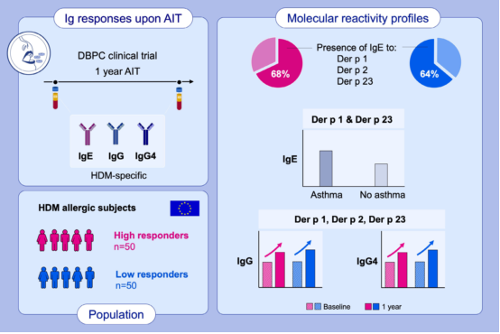 Methods: : Serum levels of IgE, IgG and IgG4 to 13 Dermatophagoides pteronyssinus molecules were measured at baseline and after 1-year AIT, using allergen microarrays in 100 subjects exhibiting high or low clinical benefit.
