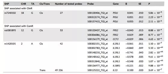 ?、?全基因組協(xié)會(GWA)的研究已經(jīng)明確與哮喘發(fā)生相關的基因,但是沒有研究哮喘緩解;② 臨床緩解(ClinR)的定義是,最近一年中沒有哮喘治療和喘息,最近3年內(nèi)無哮喘發(fā)作,完全緩解(ComR)在臨床緩解的條件基礎上,還必須保持正常肺功能和無支氣管高反應性(BHR);③ 評估了2個獨立群體(總n = 456)中25個頂端單核苷酸多態(tài)性(SNPs)的復制情況,然后對肺組織和上皮細胞中4個復制的SNP進行定量位點表達(eQTL)分析;④ 本研究確定了3個與完全哮喘緩解相關的SNP,其中2個SNP與FRS2、CCT、IL1RL1、IL18R1和IL13有生物學相關性;⑤ 本研究三個相關SNP分別為rs7240102、rs6581895和rs1420101。