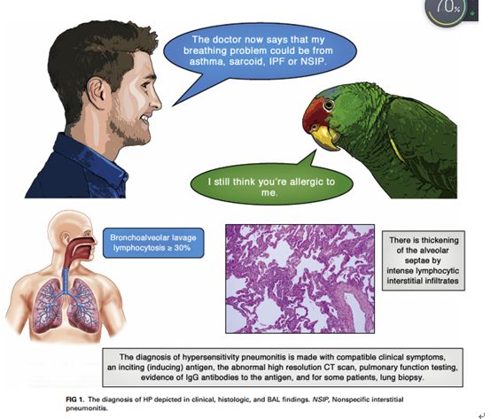 過敏性肺炎(HP)是一種TH1淋巴細胞偏向性纖維性肺泡炎,由多種抗原引起,包括禽排泄物、真菌、嗜熱細菌和原生動物,以及工作場所發(fā)現(xiàn)的反應(yīng)性化學(xué)物質(zhì)。與病毒綜合征相似,急性暴露于刺激抗原可導(dǎo)致突然出現(xiàn)無生產(chǎn)能力的咳嗽、呼吸困難、伴有關(guān)節(jié)痛的寒戰(zhàn)或不 適,通常在4至8小時后發(fā)生,因此抗原暴露與癥狀之間的時間關(guān)系可能沒有受到懷疑。HP組織學(xué)表現(xiàn)為明顯的淋巴細胞浸潤,使肺泡間隔增厚,伴有肉芽腫或巨細胞。幾乎所有患者的支氣管肺泡灌洗液中淋巴細胞都超過20%。高分辨率計算機斷層檢查的異常情況:從急性/亞急性疾病的結(jié)節(jié)性小葉中心混濁到晚期疾病患者典型的以上葉為主的網(wǎng)狀斑紋和蜂窩狀纖維化。描述詞匯包括“鑲嵌樣”衰減和毛玻璃混濁。反復(fù)發(fā)作可導(dǎo)致結(jié)節(jié)性肺浸潤和可疑的非特異性間質(zhì)性肺炎或特發(fā)性肺纖維化。在廣泛的肺纖維化或限制性肺疾病發(fā)生之前,臨床醫(yī)生需要高度懷疑才能對HP做出早期診斷。美國胸科學(xué)會的一個專家小組評論道:“對于懷疑患有間質(zhì)性肺病的患者進行BAL,我們建議淋巴細胞亞群分析不是BAL細胞分析的常規(guī)組成部分。什么構(gòu)成了對診斷的“高度自信”是一個有爭議的問題。在沒有診斷試驗的情況下,診斷需符合臨床癥狀、刺激(誘導(dǎo))抗原、異常高分辨率計算機斷層掃描(CT)、肺功能檢測、抗原特異性IgG抗體的證據(jù)、部分患者需肺活檢。